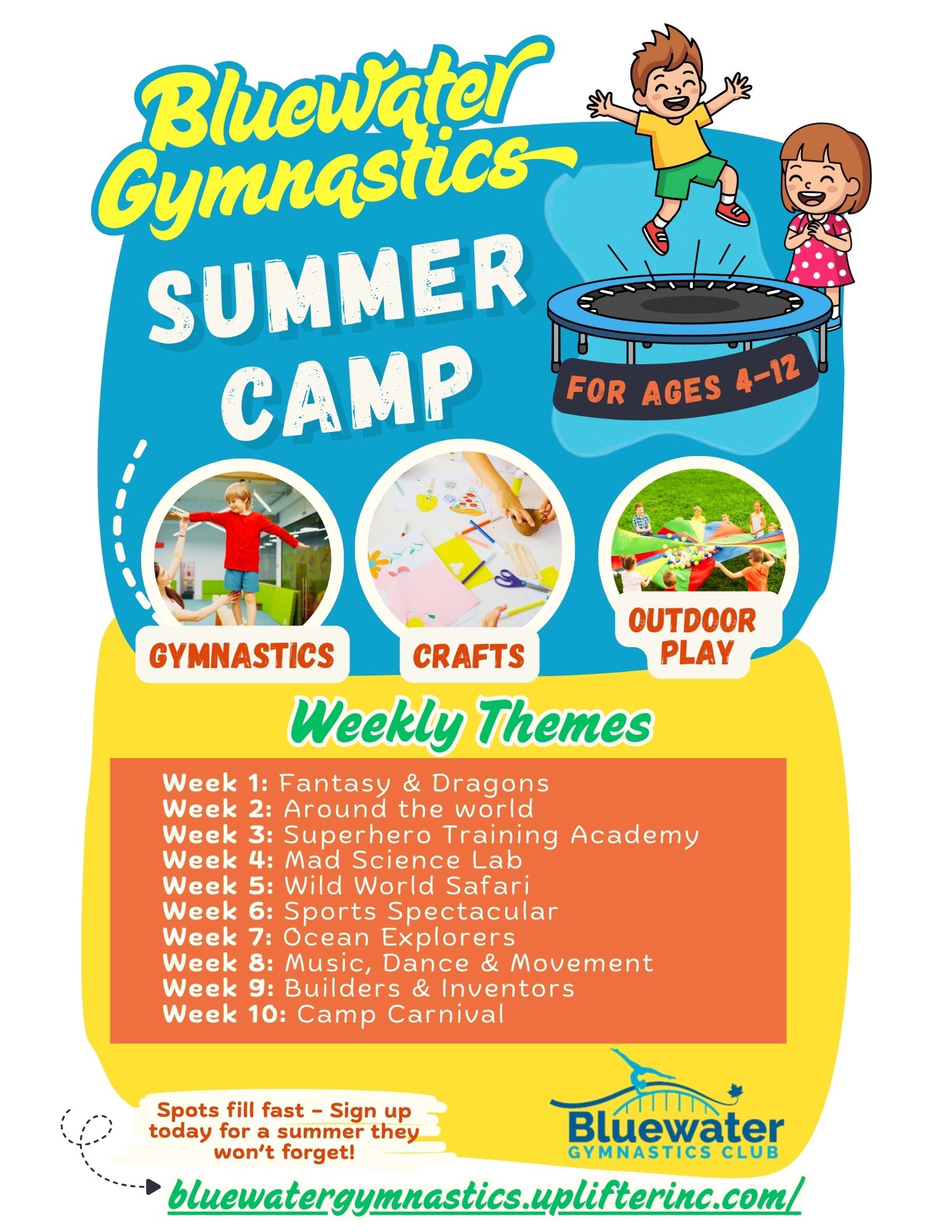 Our full-day camp include gymnastics, trampoline, indoor rock climbing, Ninja obstacle courses, indoor and outdoor games, crafts, and other fun activities. Please pack a peanut/nut free lunch and snacks.